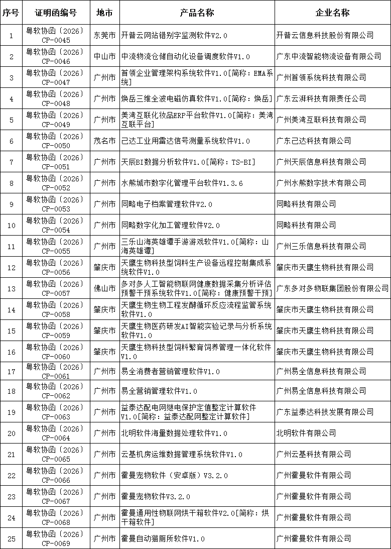 广东省2026年3月软件产品评估通过名单(25项)